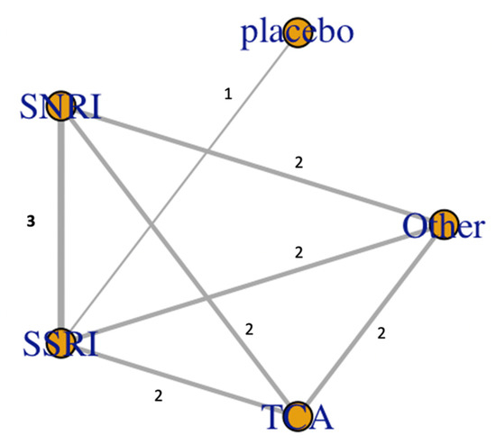 Network plot represented comparison among antidepressants, the network’s edge thickness corresponded with number of studies included (numbers on the edge are the number of included studies).