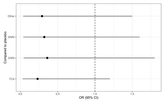 Forest plot demonstrated the relative effect of antidepressants compared to placebo.