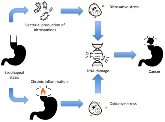 Overgrowth of nitrate-reducing bacteria due to esophageal food stasis leads to increased volatile N-nitrosamines concentration in the esophageal lumen [19]. N-nitrosamines originated with nitric oxide reactions [20]. Overproduction of reactive nitrogen species (RNS) leads to nitrosative stress [20]. In this circumstance, there will be damage to the lipids, proteins, and nucleic acids [20], and consequently, lead to genotoxic and carcinogenic effects, as demonstrated in animal models [21]. RNS concentration can be increased by the excess of food intake or by endogenous production in the food stasis [21]. Esophageal achalasia has specific microbiota, which may vary according to the grade of dilatation [22]. Among the microorganisms found in the achalasia esophagus, Staphylococcus sp., Corynebacterium sp., Peptostreptococcus sp., and Veillonella sp. can produce N-nitrosamines [22]. N-nitrosamines under certain pH conditions decompose into alkyldiazhydroxide species, and the alkylation of the DNA produces modified purine and pyrimidine bases [23].