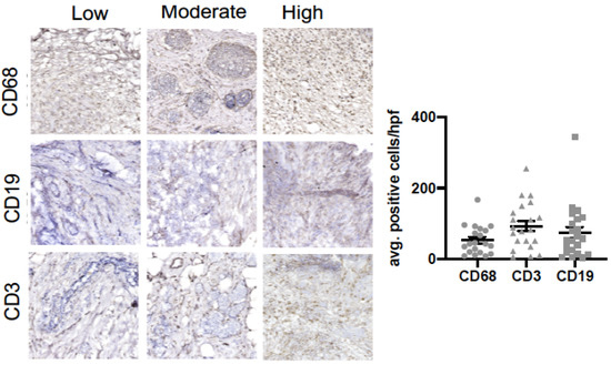 We also assessed if a relationship existed between intra-tumoral infiltrates representative of the innate (macrophage) and adaptive (B cell and T cell) immune response and clinicopathological variables (Figure 1 and Table 2). Figure 1 shows representative images of macrophages (CD68), B cells (CD19), and T cells (CD3) in our cohort. Our data show that an increased tumoral infiltration of T cells and decreased B cell infiltration were positively associated with increased age (p < 0.01). Macrophage infiltration was associated with postmenopausal status (p < 0.05), active chemotherapy (p < 0.01), and positive lymph nodes (p < 0.05). Macrophage infiltration was associated with past mental health services (p < 0.05) and lack of social support (p < 0.05).