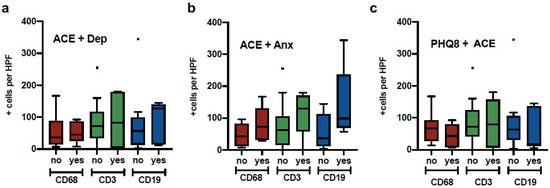 Figure 2 illustrates the distribution of comparisons between macrophages (CD68+ cells), T cells (CD3+ cells), and B cells (CD19+ cells) with ACE plus depression, ACE plus anxiety, and history of trauma (THQ) plus ACE. Analyses did not yield significant results; however, the ACE plus anxiety group presented the most infiltration of the three types of immune cells (p = 0.06).
