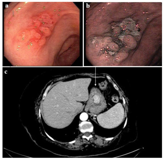 The complete diagnostic investigation of a patient with MiNEN involves performing an upper gastrointestinal endoscopy and a contrast-enhanced CT scan [19]. In CT analysis, the neuroendocrine carcinoma images tend to appear as isodense lesions at the pre-contrast phase, with marked enhancement after the administration of intravenous contrast in the arterial phase, as demonstrated in Figure 2 in this study [23,24,25]. With regard to the endoscopic aspect, MiNENs often present with typical appearances: in white-imaging endoscopy, it is usually possible to see the mucosal hyperemia in the lesion area, commonly associated with a central depression; when using endoscopic magnification, a central discoloration linked to visible subepithelial capillaries is typically noted, making a corkscrew pattern [26]. Therefore, NECs are usually seen on endoscopy imaging as a solitary lesion, generally with at least 2 cm in its greater diameter, and most commonly located in the gastric body or fundus [27].