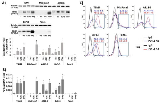 Effect of Insulin and IGF on PD-L1 expression in PDAC cells. (A,B) the PDAC lines A818-6, T3M4, BxPc3, MiaPaca2, and Panc1 were kept at low FCS concentration (0.3% (v/v)) for 24 h. Then, cells were either left untreated or were treated for (A,C) 24 h and (B) 16 h with 0.1 IU/mL insulin, 0.1 µg/mL IGF1 or, for comparison, with 50 ng/mL IFNγ. (A) Western blot analysis using PD-L1 and Tubulin antibodies. Representative blots from four independent experiments and band densitometry analysis (lower panel, # p < 0.05 compared to untreated) are shown. (B) qPCR analysis using PD-L1 and RPL13 primers (the latter used as control). PD-L1 expression was normalized to the expression level of RPL13, and data represent the mean ± SD from four independent experiments (* p < 0.03 compared to untreated). (C) Non-permeabilized cells were immunostained with anti-PD-L1 or IgG control antibodies and analyzed by fluorescence flow cytometry. A representative result from four independent experiments is shown. The percentage of PD-L1 positive cells (boxed areas) are indicated (mean ± SD, * p < 0.05 compared to untreated).