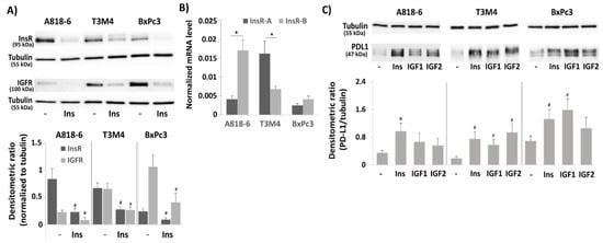 Next, we analyzed A818-6, T3M4, and BxPc3 cells for the expression of InsR and IGFR. As shown by Western blot (Figure 2A), InsR expression was much higher in A818-6 and T3M4 cells than in BxPc3 cells. IGFR expression was highest in BxPc3 cells followed by T3M4 cells, whereas it was almost absent in A818-6 cells. Typically, treatment with insulin reduced the amount of InsR and IGFR protein as both are internalized and degraded upon ligand binding. Since the two isoforms of the InsR—InsR-A and InsR-B—differ in their signal transduction and could thereby account for the differential responsiveness to insulin in the PDAC cells, qPCR analysis was done to discriminate between these two receptor variants (the antibody used for Western blotting detects both isoforms). As shown in Figure 2B, A818-6 cells expressed InsR-B at a much higher level than InsR-A, whereas T3M4 cells expressed InsR-A at a higher level than InsR-B. By contrast, BxPc3 cells show only low expression of both InsRs. From this expression pattern, it can be assumed that the PD-L1 inducing signal of insulin mainly involves InsR-B homo- and InsR-A/B heterodimers in A818-6, InsR-A/IGFR heterodimers in T3M4, and IGFRs in BxPc3 cells. This was also supported by the observation that in InsR-A-expressing T3M4 cells, IGF2 showed a greater effect on PD-L1 expression than IGF1, whereas the effect of IGF2 was weaker than IGF1 in A818-6 cells and BxPc3 cells (Figure 2C).