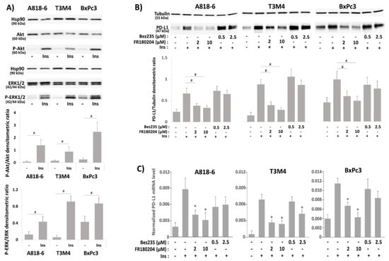 Signal transduction underlying the effect of insulin on PD-L1 expression in PDAC cells. (A) Serum-starved A818-6, T3M4, and BxPc3 cells were either left untreated or were treated for 20 min with 0.1 IU/mL insulin. (B,C), Serum-starved A818-6, T3M4, and BxPc3 cells either pretreated with the ERK1/2 inhibitor FR180204 (2 µM or 10 µM) or the PI3K inhibitor Bez235 (0.5 µM or 2.5 µM) for 1 h, or left without pretreatment were treated for (B) 24h or (C) 16 h with 0.1 IU/mL insulin or left without any treatment. (A,B) Western blot analysis using (A) anti P-ERK1/2, P-Akt, ERK1/2, Akt, and Hsp90 antibodies or (B) PD-L1 and tubulin antibodies. Representative blots from four independent experiments and band densitometry analyses (lower panels, # p < 0.05, n = 4) are shown. (C) qPCR analysis using PD-L1 and RPL13 primers was performed. PD-L1 expression was normalized to the expression level of RPL13, and data represent the mean ± SD from four independent experiments (* p < 0.03 compared to insulin treatment alone).