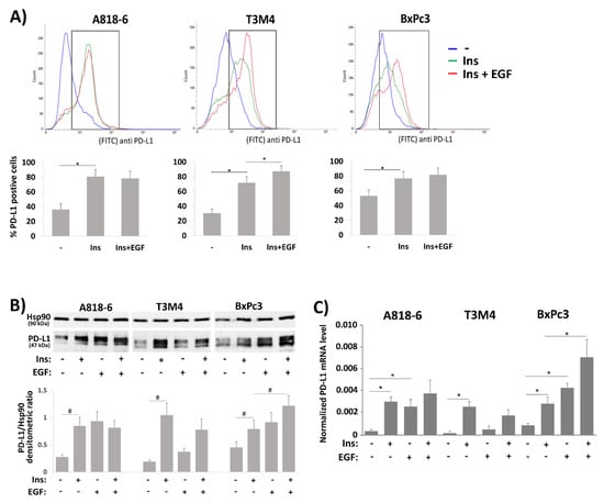 As shown by Western blot and qPCR (Figure 4B,C), administration of EGF alone increased PD-L1 expression in A818-6 to a similar extent as insulin but the combination of both revealed no stronger effect on PD-L1 expression. In BxPc3 cells, EGF more efficiently induced PD-L1 expression than insulin and the combination of both greatly enhanced it. By contrast, PD-L1 expression in T3M4 cells was only moderately induced by EGF treatment compared to the much stronger effect by insulin treatment, and the combined treatment with insulin and EGF resulted in a somewhat weaker PD-L1 induction.
