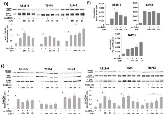 Next, EGF treatment was conducted at different time points before insulin administration. As shown in Figure 4D,E, PD-L1 expression in A818-6 cells was most strongly enhanced by longer EGF pretreatment (-24 h and −16 h respectively), whereas in BxPc3 cells, only the shorter preincubation (−1 h) enhanced the insulin-induced PD-L1 expression. In T3M4 cells, the insulin-induced PD-L1 expression became even weaker when EGF was administered 1 h before. Regarding the phospho-ERK1/2 expression level (Figure 4F), the inducing effect of insulin was enhanced by long-term pretreatment with EGF (−24 h and −6 h) in A818-6 cells whereas in BxPc3 cells, particularly the short-term pretreatment (−1 h) with EGF led to a strong increase of the insulin-induced phospho-ERK1/2 level. In T3M4 cells, EGF pretreatment (−6 h and −1 h) even reduced the insulin-induced phospho-ERK1/2. Under the same conditions, the level of insulin-induced phospho-Akt was only moderately affected by EGF pretreatment.