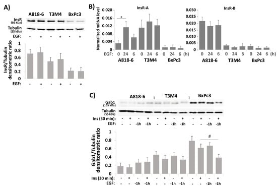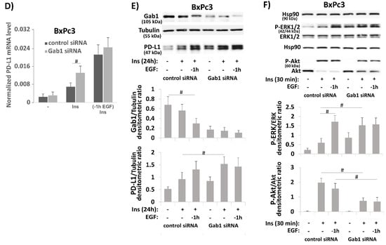 The effect of EGF on insulin-induced PD-L1 expression in PDAC cells involves different mechanisms. (A,B) Serum-starved A818-6, T3M4, and BxPc3 cells were either left untreated or treated with 10 ng/mL EGF for (A) 24 h or (B) 6 h and 24 h. (A) Western blot analysis using InsR and tubulin antibodies. (B) qPCR analysis using InsR-A, InsR-B, and RPL13 primers. InsR-A and InsR-B expression is normalized to the expression level of RPL13, and data represent the mean ± SD from four independent experiments (* p < 0.02 compared to untreated). (C) Serum-starved A818-6, T3M4, and BxPc3 cells were either left untreated or treated with 0.1 IU/mL insulin for 30 min either alone or after preincubation for the indicated periods with 10 ng/mL EGF. Then, Western blot analysis using Gab1 and tubulin antibodies was performed. (D–F) BxPc3 cells were treated with control or Gab1 siRNA for 24 h followed by serum starvation for 24 h. Then, cells either left untreated or were treatment with 0.1 IU/mL insulin for 16 h (D), 24 h (E) or 30 min (F) either in the absence or presence of 10 ng/mL EGF administered 1 h before. (D) qPCR analysis using PD-L1 and RPL13 primers. PD-L1 expression is normalized to the expression level of RPL13, and data represent the mean ± SD from four independent experiments (* p < 0.05). (E,F) Western blot analysis using (E) PD-L1, Gab1, and tubulin antibodies or (F) P-ERK1/2, ERK1/2, P-Akt, Akt, and Hsp90 antibodies. (A,C,E,F) Representative blots from four independent experiments and band densitometry analyses (lower panels, # p < 0.05, n = 4) are shown.