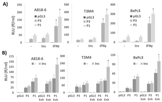 In the next set of experiments, we aimed to verify the effect of ERK1/2 activation on insulin-induced PD-L1 expression by means of luciferase assays with PD-L1 promoter constructs. As shown in Figure 6A, in A818-6, T3M4, and BxPc3 cells, two different luciferase constructs were tested for their inducibility by insulin. When containing a 1.3 kb region of the 5′flanking region from the human PD-L1 gene (construct P1, see Figure S3 in the Supplemental Information), insulin treatment only slightly induced luciferase expression (Figure 6A). For comparison, IFNγ strongly activated this 1.3 kb promoter, as expected from the presence of three IRF binding sites within this gene region [43].