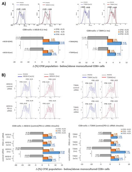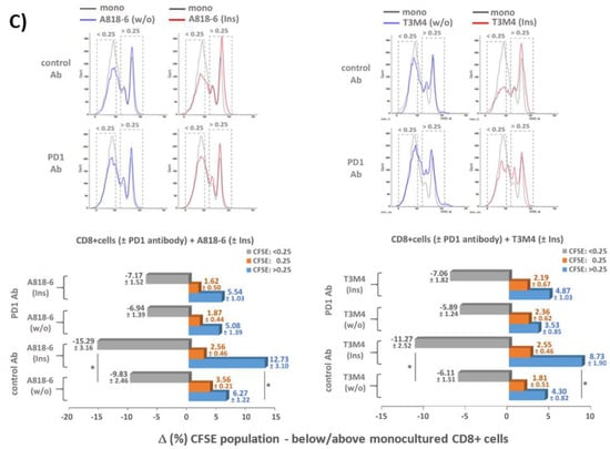 Next, we explored the functional effect of insulin-induced PD-L1 expression in coculture experiments with CD8+ T-cells. For this purpose, A818-6 and T3M4 cells that exhibit the strongest PD-L1 inducing effect by insulin (see above) were directly cocultured with preactivated (anti CD28/CD3 + IL-2 treatment for 4 days) and carboxyfluorescein succinimidyl ester (CFSE) labeled human CD8 + T-cells. When analyzing the CFSE staining intensity of the CD8+ T-cells by flow cytometry (Figure 7A) it was seen that compared to monocultured T-cells, those cocultured with A818-6 or T3M4 cells for 3 days showed a significant shift from less CFSE stained (intensity <0.25-fold = greater proliferation) towards higher CFSE-stained fractions (>0.25-fold = reduced proliferation). This shift by the coculture was even more pronounced when both PDAC cell lines were preincubated with insulin for 24 h, fitting together with the increased PD-L1 expression under this condition (see above and Figure S4 in The Supplemental Information).