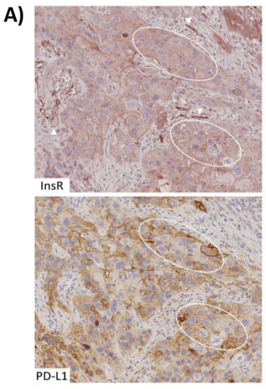 Finally, we explored the expression of PD-L1 by immunohistochemistry in InsR-expressing PDAC samples (Figure 8). InsR was expressed in cancer cells as well as in cancer vasculature (Figure 8A). The staining intensities of InsR differed between the specimens, ranging from strong (2+) InsR expression in the cytoplasm (0–88%) and at the membrane (0–100%) of cancer cells, to weak (1+) cytoplasmic (0–100%) and membranous (0–70%) InsR expression. Areas devoid (0) of membranous and cytoplasmic InsR expression within the specimen varied between 0–95% and 0–70%, respectively. The extent of vascular InsR expression varied between the respective specimens, ranging from strong (2+) expression (0–100%), to weak (1+) expression (0–90%) or lacking (0) vascular InsR expression (0–100%).