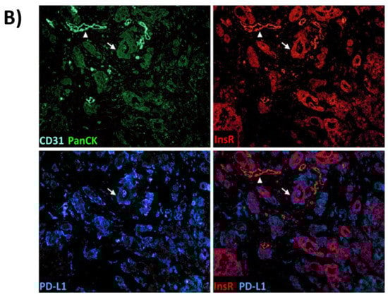 To demonstrate colocalization of PD-L1 and InsR in the cancer cells, immunofluorescence was carried out using PD-L1 and InsR antibodies (Figure 8B). Concomitant immunofluorescence staining with PanCK and CD31 antibodies generally mapped all tumor cells as well as vessels within the region of interest. As it can be appreciated from Figure 8B, colocalization of PD-L1 and InsR was observed in the tumor cells but not in the tumor vasculature. Furthermore, InsR expression was visible in the cytoplasm of tumor cells indicating InsR activation by the insulin/IGF axis. Intriguingly, InsR staining regularly colocalized with PD-L1, thus underlining the association of the insulin/IGF axis with PD-L1-mediated immune control. We retrospectively assessed the T2DM status for the three InsR-expressing PD-L1-positive PDAC patients. Clinical data were available for only two out of three, with none of the respective patients having been documented to suffer from T2DM. HbA1c or fasting glucose values were not available for those patients.