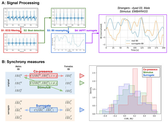 Figure 1. Data analysis: (A) Pipeline for the processing of the electrocardiogram (ECG) signal with the four main steps and the final result with the real and surrogate inter-beat interval (IBI) series signal for one subject and stimulus. (B) Three types of physiological synchrony and computation schemes, with the output distribution of the measures.