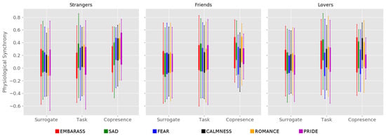 We come into contact with numerous people in our daily lives, some of whom are strangers with whom we walk side-by-sid, but others are friends or romantic partners with whom we share most of our personal lives. Physiological synchrony underlies some of the social affiliative processes that forges and maintains these relationships [11,15,16,17,18]. It is therefore important to understand how the mere presence of others and our relationships with them affect us at the autonomic physiological level. Our study systematically investigated how physiological synchrony occurs in the copresence of dyads who are romantic couples, friends, or strangers when induced with different emotional states. Our first hypothesis that synchrony would be enhanced as a function of relationship closeness (i.e., lovers > friends > strangers) was not fulfilled. On the contrary, we found that strangers exhibited greater synchrony than lovers and friends across several emotional states. Second, we expected that the type of relationship and emotional state will influence the extent of physiological synchrony. Our hypothesis that the mere copresence of strangers would be associated with physiological synchrony in fearful and embarrassing emotional states was partially fulfilled. With some notable differences, we replicated the results in Golland and colleagues [9] and showed that copresence of strangers elicited synchrony in fearful situations. However, instead of exhibiting synchrony in embarrassing situations, synchrony was instead observed when pride was induced. We also hypothesised that lovers and friends would exhibit synchrony in an array of positive and negative emotional states. This hypothesis was partially fulfilled as the copresence of lovers and friends were related to positive emotional states of calmness and romance, respectively.
