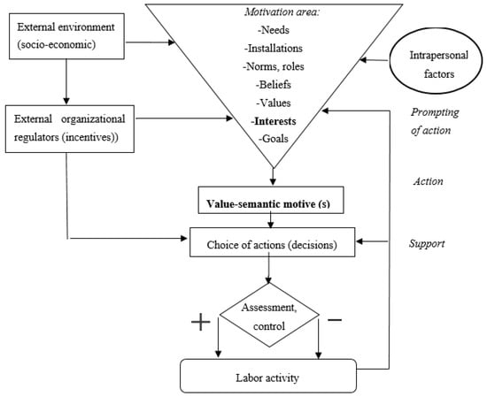 Despite a significant body of academic literature relevant to the analysis of various aspects of economic, professional, public, and personal interests published in the second half of the 20th century, a number of insufficiently studied theoretical and practical questions still remain [] (pp.185–191) [] (pp.44–45) [,]. Among them are the historical, gnoseological, and ontological nature of labor interest, and the factors that determine it; forms and conditions for the realization of interests under modern circumstances; the role and place of labor interests in the economic system of society; regularities in the formation, functioning, and development of labor interests; and trends in their transformation. The problem of determination and dynamics of the phenomenon of such interest is also insufficiently developed in the area of social psychology, labor psychology, and organizational psychology []. According to Eberhard Todt [], interests are relatively long and generalized tendencies of behavior, closely related to the development of the image of the ego. Karl Mierke singles out the phenomenological, functional, and structural-psychological aspects of the consideration of interest []. As stated by H. B. English & A. Ch. English, interest mattered as the importance of attitude or focuses of attention, that is, the sense of significance []. According to the Soviet psychologist and philosopher S.L. Rubinstein, interest in the psychological sense of the word is a specific orientation of the individual, consisting of the concentration of his thoughts on a particular subject []. E. P. Ilin Doctor of Psychology, Professor of St. Petersburg University carried out detailed theoretical analysis of the notion of interest in 2002 []. He classifies interest as “types of motivational formations”, including motivational states, motivational attitudes, drives, desires, volitions, inclinations, and habits. At the same time, interest appears a key component of the motive, determining personal preferences in the needs and ways of satisfying them, in the desire to act. James Rounds and Rong Su proposed a theoretical model that points to the relationship between interest, motivation, behavior, and result. The presence of interest activates the process of motivation, influencing the formation of activity goals, sustainability, and focus of efforts. This mechanism forms program–target behavior, leading to clear-cut motivational results. Accordingly, the more stable is the labor interest in the activities, the more efforts an employee exerts, resulting in higher effectiveness and performance [] (pp.98–103). According to another theory by Michael Ingerick and Michael G. Rumsey [] (pp.165–181), there are three key determinants of labor behavior: motivation, knowledge, and experience, and occupational skills (habits). Michael Armstrong refers motivation to the “factors that cause people to behave in a certain way” []. Before the labor action, explaining and justifying it, motivation can serve either as an impulse for action or as a means of blocking it. However, the motive itself is not a driving factor, but acts as a link between such regulators of labor behavior as needs, interests, goals and values, attitudes, and standards.