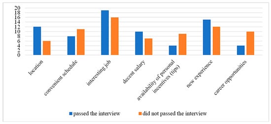 Figure 2 contains the results of respondents’ answers about the reasons for choosing a job in a particular company. When answering this question, the interests of those who passed and did not pass the evaluation interview differed.