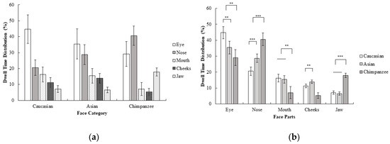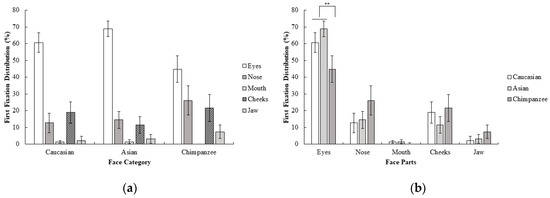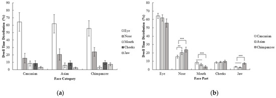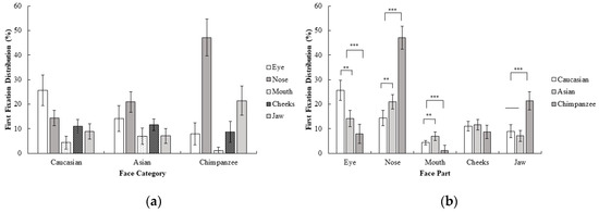 Examining the gaze behavior of participants while face processing helps us to understand the underlying mechanism of face perception. Previous studies consistently point out that the eye is the most informative and diagnostic area during a sex categorization task with own-race faces [13,14], but several eye-tracking studies indicate that an observer’s gaze initially shifts to the nose region [15,16] rather than the eyes. Several studies also indicate that during face perception tasks, the gaze pattern of participants can change for other-race and other-species faces. For example, one study [17] found that during race categorization, participants mostly attend to the eye region of own-race faces, but to the nose and mouth region of other-race faces. These studies indicate different gaze behavior of participants for other-race and other-species faces compared to own-race faces. However, to the best of our knowledge, none of these previous studies examined the gaze behavior of participants during a sex categorization task with other-race and other-species faces. Therefore, in the current study, we aimed to examine the gaze behavior of participants during a sex categorization task with own-race, other-race, and other-species faces.