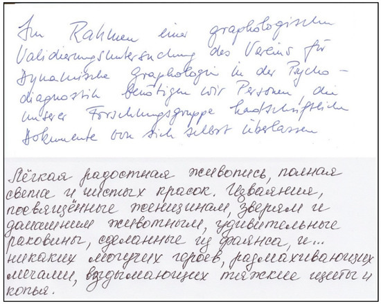 The test persons were recruited in different areas (work, through colleagues, at events, and via newspaper ads). A required criteria for taking part in the experiment was the ability to write fluently by hand in one’s mother language and the willingness to complete the 16PF-R-questionnaire in German or English. Among the 58 test persons, 44 were German-speaking, 13 Russian-speaking, and 1 English-speaking.