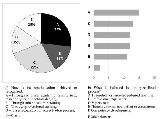 The idea of specialization as a constitutive professional element is entrenched in European culture. It is influenced by the works of Adam Smith and Charles Darwin [], in which it is seen as a way for improving productivity and the quality of work and as a means by which a species adapts to their environment. Specialization is also consonant with the rapid progression of science in general, of which psychology is no exception. The perceived durability of knowledge is, on average, 8.68 year for different fields of psychology []. In professional organizations, specialization processes and specialization titles constitute hallmarks to promote professional development. In these organizations, specialization frameworks often result from professional consensus and reflect different professional realities.