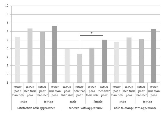 The distribution between female and male participants in the group “rather poor than rich” does not differ significantly from the group “rather rich than poor”. Both male and female participants, independent from self-evaluated economic status, show similar satisfaction with appearance and wish to change their appearance. Additionally, we revealed that males in the group “rather rich than poor” demonstrate significantly lower concern with appearance when compared with females in this economic status group.