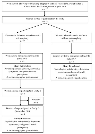 This was a mixed-methods study based on structured interviews and psychological tests performed on women exposed to ZIKV during pregnancy in 2015 and 2016. Study design took place in three different phases according to the population’s sub-groups and timeline. In 2016, study Ia was developed to conduct psychological tests (anxiety, depressive symptoms, and general health perception) and a sociodemographic questionnaire to those women who delivered a microcephalic infant. In 2017, the same tests were conducted with mothers of normocephalic infants, and a structured interview was performed (Study Ib). These women were not further contacted. In 2018, women who participated in Study Ia were contacted for performance of the psychological tests and the structured interview (Study II). Figure 1 describes the study and participants flow chart.