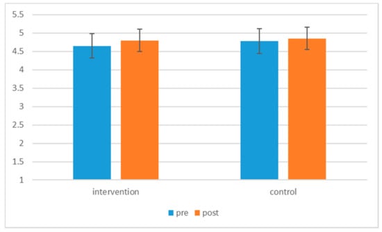A 2 × 2 repeated measures ANOVA was conducted using JMP Pro 14 to assess differences in multicultural competence between the experimental and control conditions across time, as shown in Table 1. The interaction effect of time by condition was found to be significant, F (1, 244) = 0.02, p = 0.048. Specifically, for those in the intervention condition, overall post-test scores (M = 4.80, SD = 0.67) were significantly higher than overall pre-test scores (M = 4.65, SD = 0.61), F (1, 169) = 26.06, p < 0.001. However, for those in the control condition, pre-test (M = 4.78, SD = 0.57) and post-test (M = 4.85, SD = 0.67) scores were not significantly different F (1, 75) = 2.43, p = 0.123. Results of the significant intervention effect are presented in Figure 1, and the means and standard deviations are presented in Table 2. For the main effects, the main effect of time, F (1, 244) = 0.07, p < 0.001, was significant, but the main effect condition was not significant, F (1, 244) = 0.001, p = 0.251. In other words, participants’ average multiculturalism scores in the intervention condition were not different from the scores of participants in the control condition. The results are in support of Hypothesis 1, which expected participants in the experimental condition to have a significant difference in multicultural competence scores pre- and post-intervention.