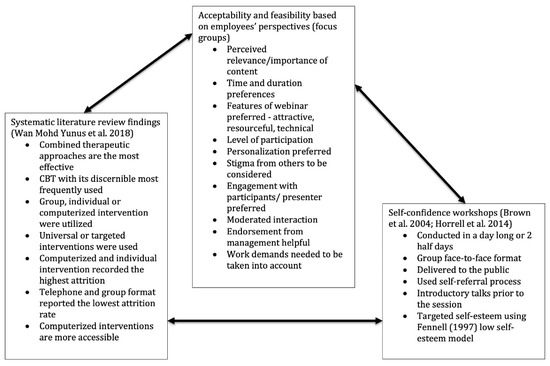 This article describes the systematic development of the self-confidence webinar intervention for depression in the workplace. The United Kingdom’s Medical Research Council (MRC) framework emphasizes various key elements related to the development of complex intervention before embarking on the evaluation phase. This framework proposes that the development of an intervention needs to be followed by a phase focused on feasibility and piloting [8,9]. The development phases also require a systematic accumulation of superior evidence preferably through a systematic review [9]. Based on these recommendations, a systematic review on available workplace intervention for depression was conducted and published [10]. In accordance with the emphasis on process evaluation observed in the updated MRC framework [11], a qualitative study was conducted that aimed to explore the acceptability, feasibility, and potential barriers to self-confidence webinars in the workplace by obtaining views of members of the potential target group of the intervention, that is, workplace employees. To capture a wide range of employees’ thoughts on such interventions, a qualitative methodology, focus groups, was chosen. These findings were then integrated with the materials from the latest self-confidence workshop for depression by Brown and colleagues [6]. Therefore, the aim of this article was to develop a self-confidence webinar intervention for depression that is suitable for delivery in the workplace and informed by the systematic review [10], proven face-to-face program by Brown and colleagues [6], and the qualitative empirical study.