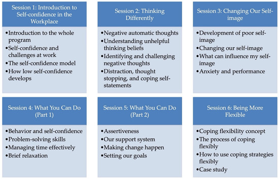 The cognitive behavior therapy (CBT) program by Brown and colleagues was evaluated in a large randomized controlled trial (RCT) on self-confidence workshop programs that were found to be clinically effective for the public [6]. However, not many employed people attended these workshops. The webinar therefore focused on employees and directed its attention more towards workplace concerns that embrace work-related undertakings as well as the communication among employees, subordinates, and colleagues. In addition, the final session touched on coping flexibility [71], which has been shown to be an important meta-skill with CBT in an RCT evaluation of interventions for depression in the workplace [34].