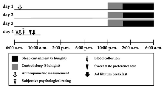 This study used a randomized crossover design with a sleep curtailment condition (5 h/night) and a control sleep condition (8 h/night). The procedure for the study is shown in Figure 1. Participants were informed of the order in which they would experience the conditions on the first day of the study. Both conditions lasted for 3 consecutive nights. The washout period between conditions was at least 3 weeks to minimize crossover effects. Women took part in the study within 2 weeks after their menstrual period because appetite and sleepiness are affected by the menstrual cycle [18,19]. Participants were asked to go to bed at the same time as usual on prior day of entering protocol. Participants were free to engage in daily activities as normal, with the exception of sleeping. They were asked to sleep at home from day 1 to day 3, with the wake-up time during the intervention period chosen by participants as being suitable for coming to the laboratory at 8:00 a.m. on day 4. Participants were instructed not to consume drinks containing caffeine or alcohol during the intervention period and not to sleep except during the prescribed sleep period.