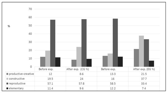 According to the results of the experimental activities that we have carried out on the formation stage, a considerable part of the future preschool educators from the experimental group demonstrated a constructive, productive, and creative level of the subject artistic competences, striving for the quality fulfillment of the professional tasks, orientation for pedagogical cooperation, and the ability to argue their own opinions with the aim of achieving the goals of the artistic and aesthetic activities. With such a level of diligence and motivation, a person who possesses already defined artistic interests is oriented on cultural values, and perseveres in achieving the goals of the pedagogical activities.