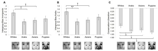 | Immigrant-Intergroup Bias | 1.53 (1.56) | 0.90 (1.48) * | 1.01 (1.35) * | 1.11 (1.46) |