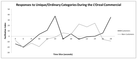 Overall, the L’Oréal commercial had differential effects on L’Oréal customers and noncustomers. In general, customers reacted negatively to the male voice-over, and positively to actress Lea talking. Customers also reacted very positively to Lea using the phrase, “Because you are totally worth it” whilst noncustomers reacted very negatively to it, and these observations are consistent with what one might expect from these two groups. All viewers associated the moment when the male voice-over is listing potential hair problems at t = 6 with Ordinary/Negative (using the negative terms such as “weak, limp, lifeless, dull, and straw-like hair”).