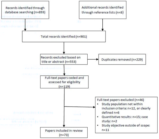 The literature search identified 901 unique papers published between 2015 and 2019 that potentially brought insight to parent’s attitudes, beliefs, and perceptions and influencers regarding infant feeding behaviors. Following title and abstract screening against inclusion criteria, full texts of 119 papers were coded and assessed for eligibility. After removing 46 studies not meeting inclusion criteria, 73 original qualitative studies served as the base for this review. Details of the studies screened, included, and excluded are on Figure 1.