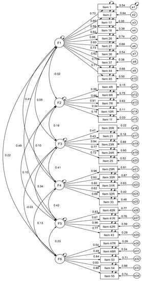 Next, factor structure of newly developed questionnaire was assessed using CFA (n = 100). Statistical indicators showed an acceptable model fit: χ2 = 748.89, df = 455, p ≤ 0.0001; χ2/df = 1.646 < 2, CFI = 0.90, RMSEA = 0.08, LO 90 = 0.07, HI 90 = 0.09, TLI = 0.87. A posteriori six-factor model of the Survey is presented in Figure 2.