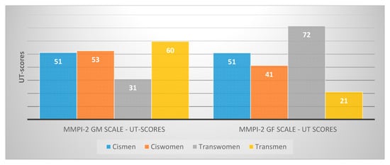 UT scores on Gender Role—Masculine (GM) and Gender Role—Feminine (GF) MMPI-2 (Minnesota Multiphasic Personality Inventory, 2nd version) scales for the cis- and transgender participants (according to Russian population norms).