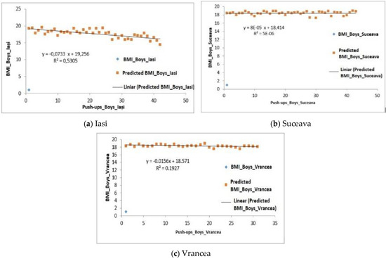 For those in the Suceava region, the recorded average was 25.37 ± 0.74 reps and the correlation between BMI and this test was also positive—F6.60 > Fsig. 0.01, R2 = 1 (Figure 7b).