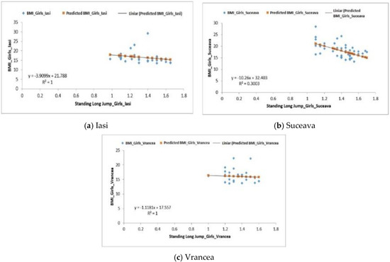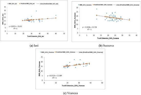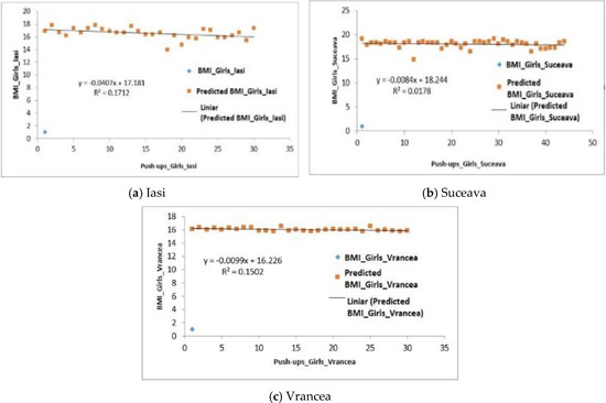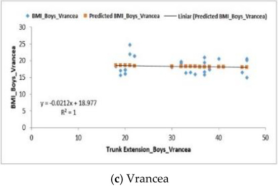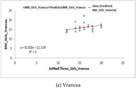 For the group of girls from the Vrancea region, a negative regression (F0.15 < Fsig 0.69) was obtained, the differences being also quite significant, p-value = 8.12 × 10−5. The values obtained for the coefficient of determination (R2) were 1 (Iasi), 0.30 (Suceava) and 1 (Vrancea) (Figure 6a–c).