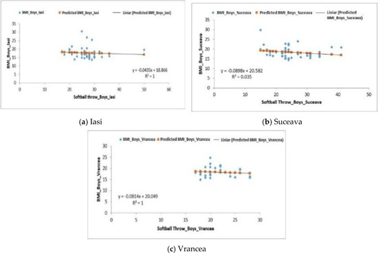 For the girls from the Iași region, the regression was positive, R2 = 0.0012 (Figure 4a). For girls, the correlation between the softball throwing test and BMI showed a negative regression for the group from the Suceava region (F0.54 > Fsig. 0.46), R2 recording a value of 0.0127 (Figure 4b) and for the one from the Vrancea region where the value of R2 was equal to one (Figure 4c), F3.89 > Fsig.0.058.. With regard to the p-value, the data displayed in Table 5 indicates that the differences are highly significant.