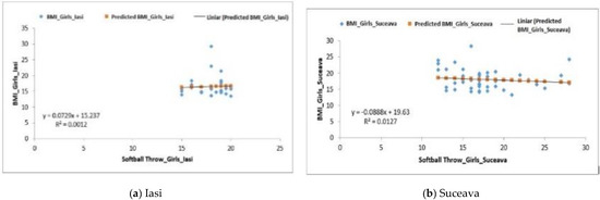 For the girls from the three analyzed regions, the averages obtained for the softball throwing test were 1.34 ± 0.44 m for the Iași region, 1.40 ± 0.03 m for the Suceava region and 1.33 ± 0.03 m for the Vrancea region (Table 5). The regression for the groups of girls from Iași and Suceava was positive: F1.69 > Fsig. 0.20 and F18.02 > Fsig. 0.0001 (Figure 6a,b). The values obtained for the p-value were 1.03 × 10−5 for the girls from the Iași region and 4.79 × 10−12 for those from the Suceava region.
