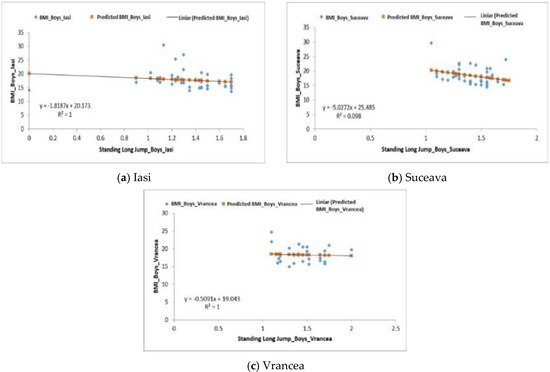 The standing long jump correlated with BMI for the groups of boys from the Iași and Suceava regions; the regression was positive F1.13 > Fsig. 0.29 for the Iași group and F4.45 > Fsig. 0.041 for the Suceava group. Negative regression F0.078 < Fsig 0.781 was recorded in boys from the Vrancea region (Figure 5a–c).