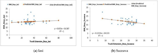 For the Trunk Extensions Test, the boys from the Iași region recorded an average of 33.17 ± 2.03 reps (Table 5). The correlation between BMI and this type of test, in this case, was a positive one— F0.65 > Fsig. 0.42, R2 = 1 (Figure 7a).