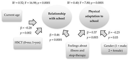 Based on the results of the correlations, hierarchical regression models are run, starting from the associated factors that have obtained a significant value. This analysis allowed to understand which factors influenced more our dependent variables, relationship with school and physical adaptation to school. In the first model, which has as its dependent variable the “relationship with the school”, the following variables have been included in the first block: age of the child, gender, diagnosis of the child/adolescent (acute lymphloblastic leukemia vs. acute myeloid leukemia) and transplant of hematopoietic stem cells (no/yes), while the variable current life of the child on stop therapy and on disease has been inserted in the second block. The second model explains most of the variance (R2 = 0.52; F = 16.98; p = 0.0001), where the minor age (β = −0.35, p = 0.0001), the not undergoing hematopoietic stem cell transplantation (HSCT) (β = -0.28, p = 0.02), and the presence of positive experiences towards disease and stop therapy (β = 0.46, p = 0.0001), positively influence the relationship with the school.