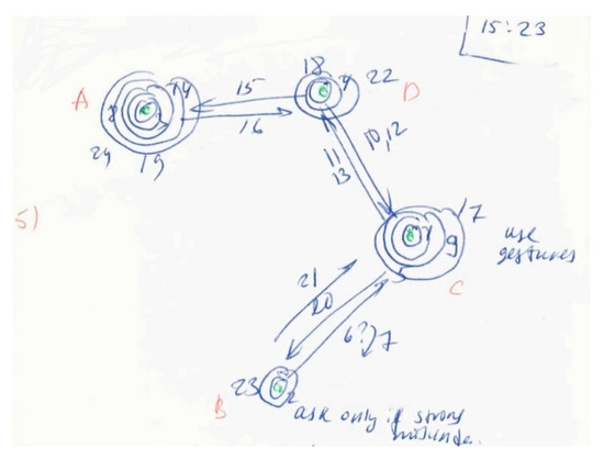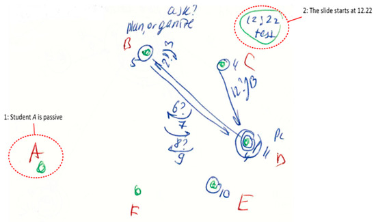 In the current study, communication behaviour was recorded by the ID method as a set of written notes and phrases. This helped to identify team roles and the changing of communication patterns during the project communication time. Figure 1 shows an example of this note-taking.