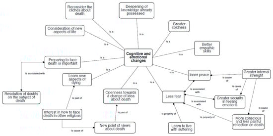 In this area, both emotional and cognitive changes emerged from the students’ narrative accounts (Figure 1). In particular, a more profound serenity and increased empathic sensation toward those who die were described. Some participants said that this experience gave them different points of view from which to look at death and made them realise that everyone lives it in their own way. Some students also said that they felt they improved their empathic skills because this experience allowed them to realise that others are suffering and dying, which is certainly painful for them and it could be painful for the students in the future, so it is important to be close to those who die and not abandon anyone, especially when there is no hope. About the experience at the hospice, they referred to feeling more serene knowing that there are people who would take care of them in the final phases of their lives and that they could live well in that last phase. This was reinforced by an intense feeling of strength and inner peace by accepting all the emotions, even the negative ones, without censoring them. For example, Marta said: “Even though death scares me terribly, thanks to the support offered by the project, I learned not only to open my horizons but also to accept and try to understand the vision of others regarding death. Understanding that others think of death and explain why we live and die differently from the way I do opened my mind and gave me the desire to think and reflect on these issues. I, therefore, think it is a useful project to be advised to learn how to face life better.” The students referred to feeling more aware that life often contains negative events and situations that cannot be avoided and, although death is difficult to accept, they feel more prepared to face it and even accept their fear of it. Concerning their perception of death, some said that speaking of death was easier; they could approach it from different perspectives more optimistically and serenely, and the thought of death did not frighten them anymore. However, some critical thoughts emerged about themselves, such as realising for the first time that nothing can be taken for granted and that so-called “knowledge” is often uncertain. Knowing and understanding the various ways that humans have managed the awareness of being mortal through religion made the students realise that, since death is an obligatory stop for every person, it is necessary for everyone to prepare during life to face it. Some students referred to this experience being formative because it focused on topics that people often do not dare confront. According to them, it was useful to have an interview with experienced people and with their peers because it enabled them to understand what they really think about the topic, something so absent from many discussions. Moreover, dealing with the theme of death helped them understand not to make partial judgements about life and other people but always to see the beauty and to avoid the error of spending time without emotions.