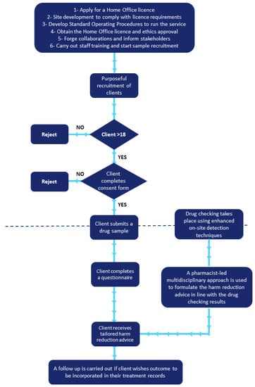 In this paper, we report the findings and learnings from establishing the first pharmacist-led, UK Home Office licensed drug checking service embedded in an established SMS. The focus of this paper is to highlight the requirements of setting up a drug checking service that operates within a licence framework from the UK Home Office. The focus is also to highlight the governance strategies required to conduct the service under the supervision and leadership of pharmacists in a SMS setting. For the purpose of this pilot, the term “drug checking” was used as this is an accurate reflection of the service offered, and it highlights that the organisations involved in this pilot do not condone drug use, provide confirmatory analysis or state that substances are “safe” to use. “Drug testing”, “pill testing” and “pill safety testing” were terms often used to imply that purity information was reported to the drug user and that the sample may be safe to use.