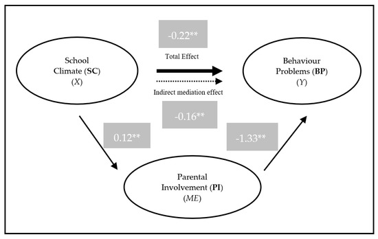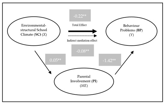 Model of the parental involvement (PI) mediation in the relationship between school climate (SC) and behavior problems (BP). X—independent variable; Y—dependent variable; ME—Mediator; ** p < 0.001.