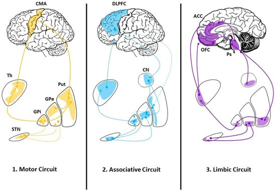 Schematic diagram of the main functional division of the cortico-basal ganglia connections sub-divided according to the main cortical projection areas. (1). The motor circuit: cortical motor areas. (2). The associative circuit: dorsolateral prefrontal cortex. (3). The limbic circuit: orbitofrontal cortex and anterior cingulate cortex (modified from Obeso et al. [45]). CMA: cortical motor areas; Th: thalamus; Put: putamen; GPe: globus pallidus pars externa; GPi: globus pallidus pars interna; STN: subthalamic nucleus; DLPFC: dorsolateral prefrontal cortex; CN: caudate nucleus; ACC: anterior cingulate cortex; OFC: orbitofrontal cortex, Ps: pons.