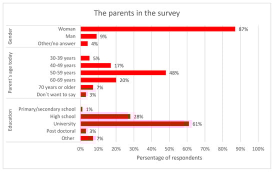 Nearly 90% of respondents were the mother of the lost child. In terms of age, 48% were in the 50–59 age range. The majority of respondents had a university or college education (Table 1 indicate the overrepresentation of women, age 50–59 years, and university education in our cohort). The data on the parents who participated in the study are presented in Figure 1.