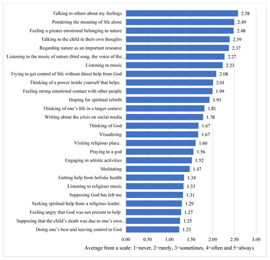 In our study, the issue of continued bonding with the deceased child did not occur within the framework of religious activities but through the secular existential meaning-making coping method talking to the child in their own thoughts. This coping method was the fourth most common coping method used by the bereaved parents in the present study. The alternative always was chosen by 35% and the alternative often by 25%.