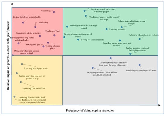 How often one uses a coping method is not equivalent to its perceived effectiveness in managing one’s crisis. In Figure 5, all coping methods above the horizontal line show a positive correlation between frequency of use and perceived effectiveness in coping with grief. For the methods below the line, this correlation was negative. The coping method with the greatest impact on perceived success in grieving was thinking of a power inside yourself that helps. That this method lies in the GREEN square means that relatively many used this method relatively often. The method that has the strongest correlation with perceived success in grieving was feeling strong emotional contact with other people. The methods found in the RED quadrant showed a relatively strong impact on perceived success in grieving, but that relatively few used these methods today. Along with the method of being able to practice visualizing, the analysis showed that it had a relatively strong impact on perceived success in grieving. The coping methods that fell to the left below the horizontal line (YELLOW square) are those few made use of and that had a relatively small effect on whether or not they coped well with their grief. In the GRAY square on the right are the methods that many people use, but that had a relatively small effect on perceived success in grieving.